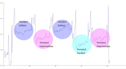 loudspeaker are crossing the fruit. Depending on the fruit texture (Here an avocado), the echo varies. It is a non destructive firmness tester